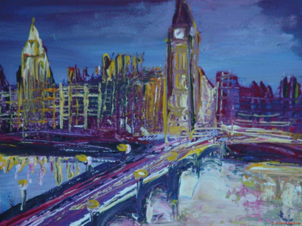 | heimat aquarell-pastellkreide-mix auf papier | villa acryl auf leinen | big ben bridge acryl auf leinen |